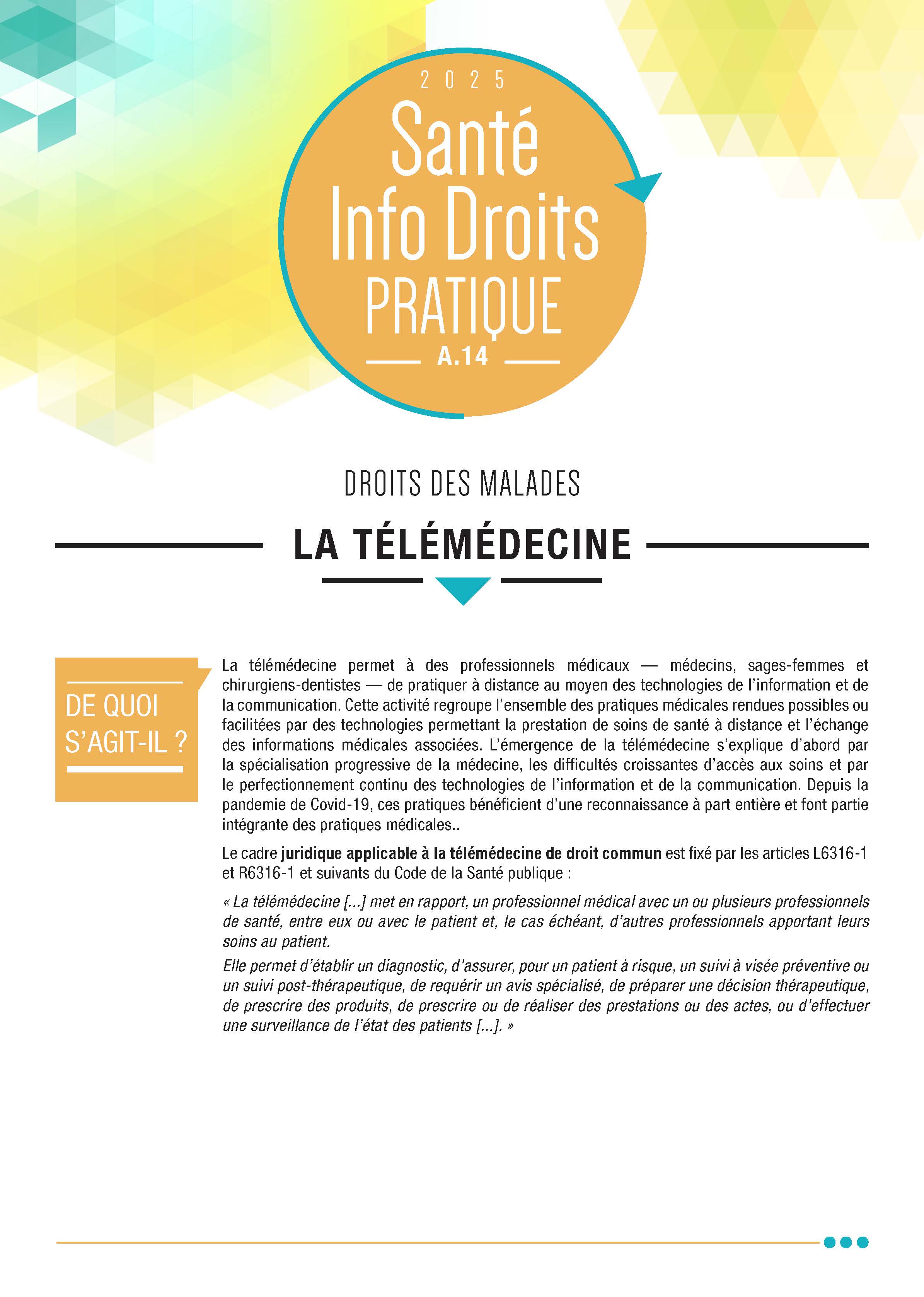 La télémédecine permet de pratiquer la médecine à distance au moyen des technologies de l’information et de la communication. Cette activité regroupe l’ensemble des pratiques médicales permises ou facilitées par des technologies qui admettent la prestation de soins de santé à distance et l’échange de l’information médicale s’y rapportant.